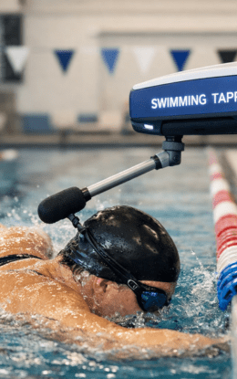 The swimmer wears a lightweight headpiece equipped with haptic motors. As the swimmer moves, the system continuously tracks their position within the virtual lane.